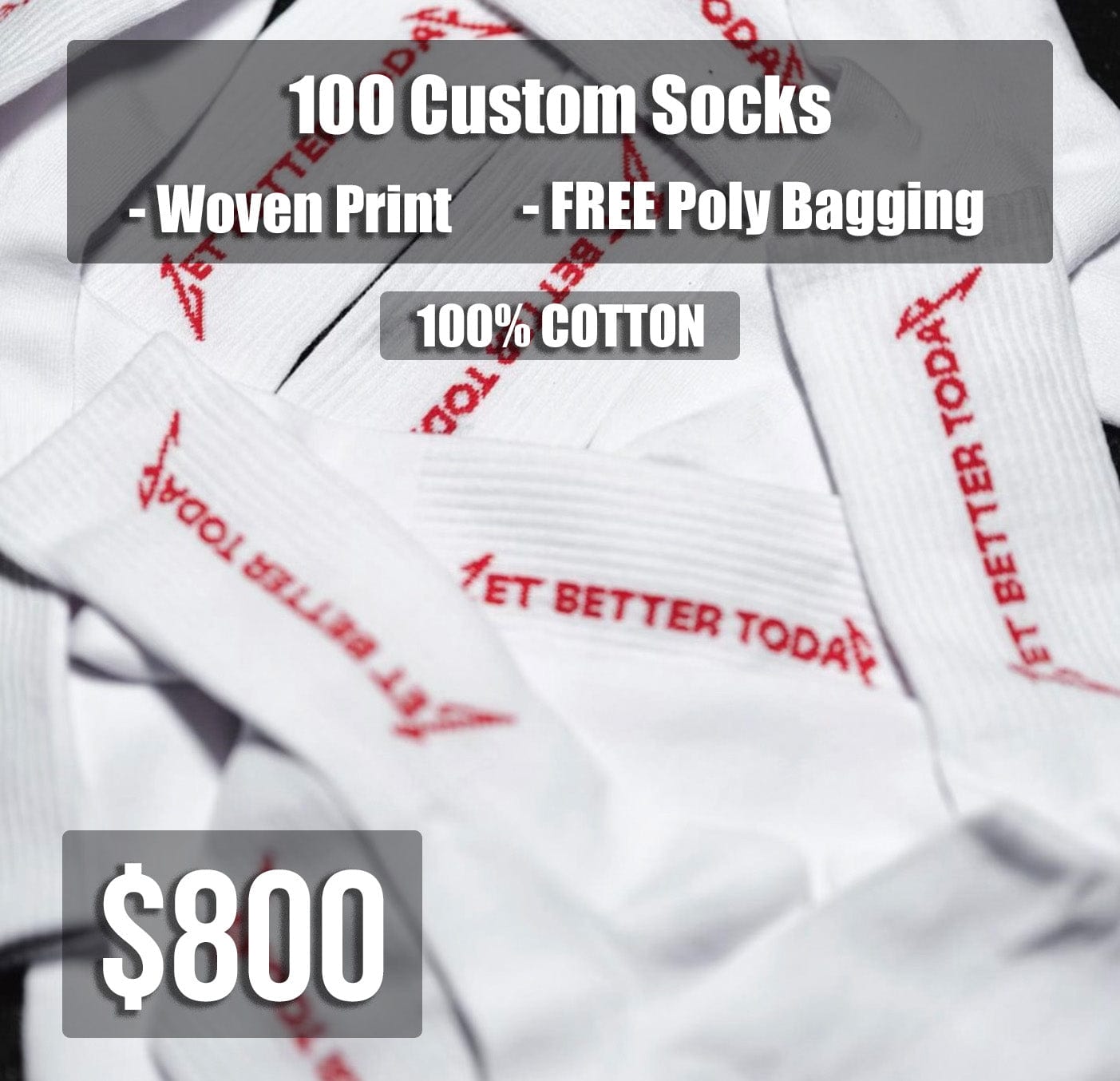 This package deal includes 100 custom woven printed socks.