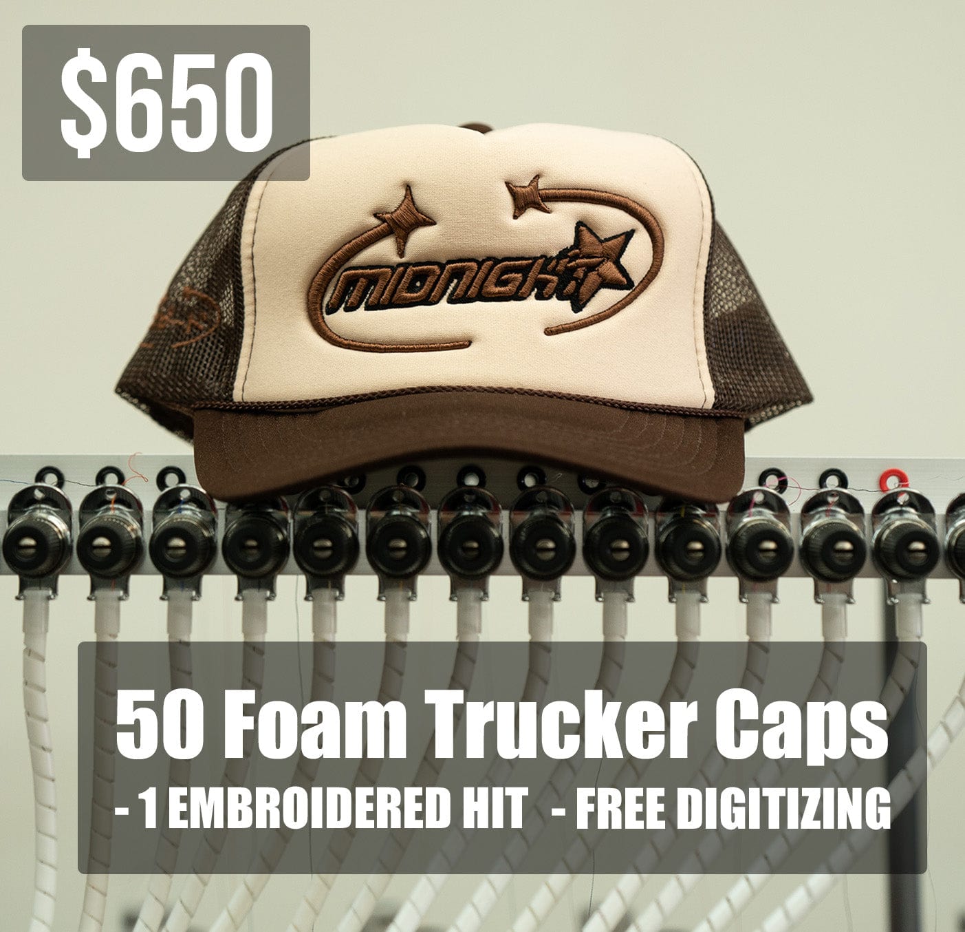 This package deal includes 50 Foam Trucker hats with 1 embroidery hit and free digitizing.