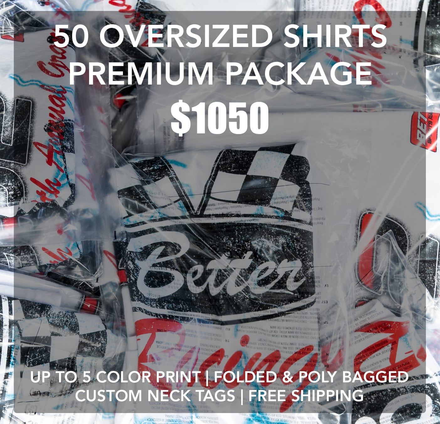 This package deal includes 50 Oversized shirts with the following: